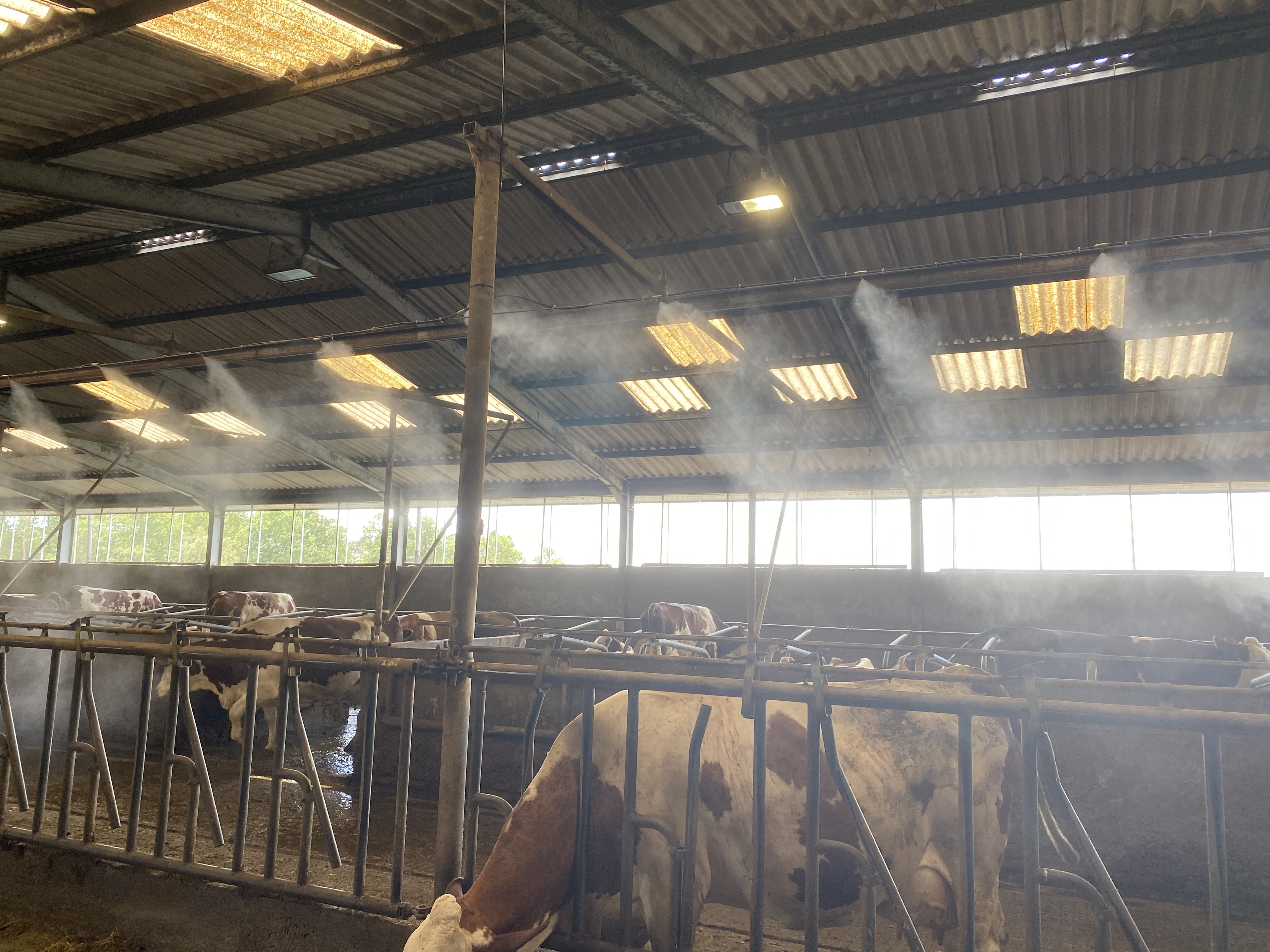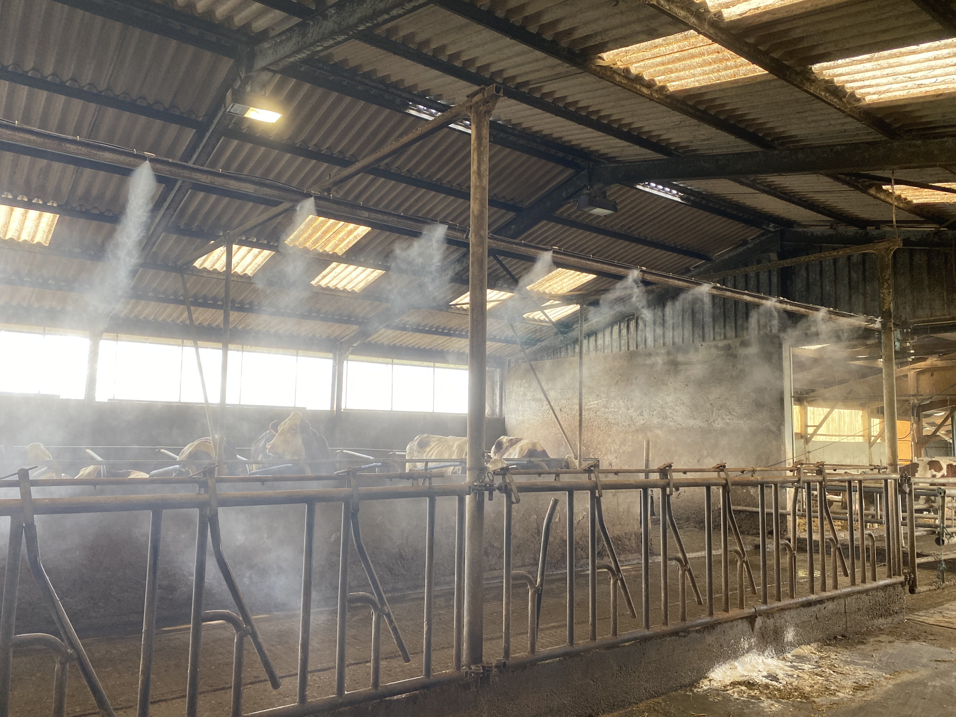 Pour optimiser le temps de l'éleveur dans le nettoyage de ses loguettes, notre solution a été d'installer un racleur en acier galvanisé sur toute la longueur du bâtiment. En addition à cette solution, nous avons préconisé deux kits de brumisation 90 buses pour réduire le stress thermique des animaux : l'un est installé dans la salle de traite et l'autre au dessus des mangeoires.